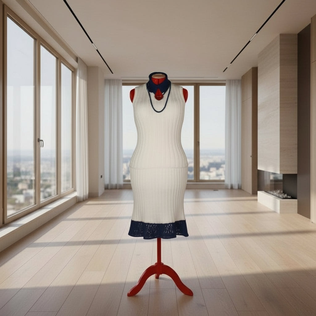 Discover this elegant two-piece knitting pattern featuring a sleeveless V-neck top with lace-trimmed stand-up collar and a fitted, form-flattering skirt with flared lace hemline. Perfect for spring and summer occasions, this sophisticated design combines a snug bodice with gently ribbed detailing and a flowing skirt silhouette. The keyhole neckline and delicate lace accents create a refined, feminine aesthetic ideal for engagements, weddings, or special celebrations. Available in sizes S, M, and L. Create your own stunning piece in luxurious wool or your preferred yarn.